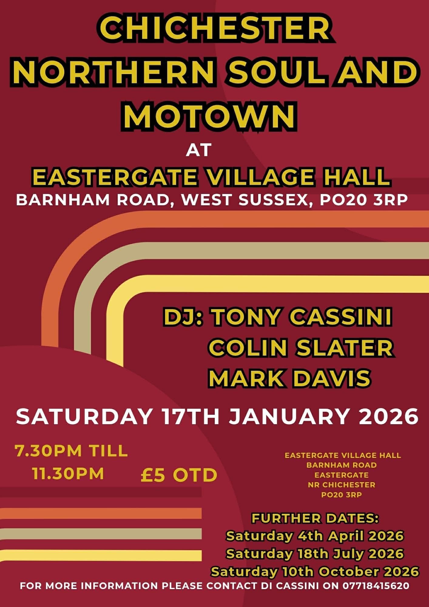 Motown and Northern Soul Event Saturday, January 17, 2026 7:30 PM 11:30 PM Eastergate Village Hall Barnham Road Eastergate Chichester, PO20 3RP (map) Google Calendar ICS
