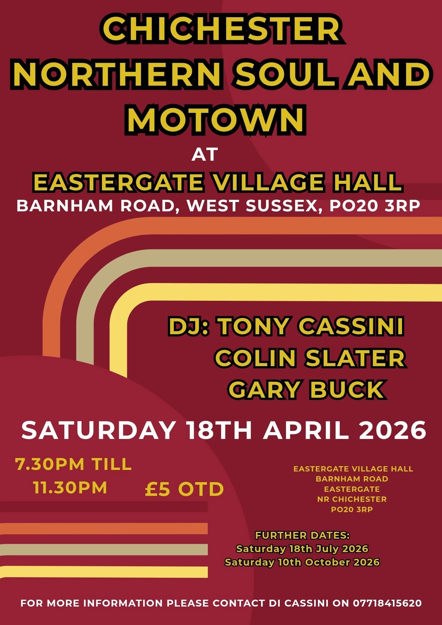 Motown and Northern Soul Event at Eastergate Village Hall Saturday, April 18, 2026 7:30 PM 11:30 PM Eastergate Village Hall Barnham Road Eastergate Chichester, PO20 3RP (map) Google Calendar ICS